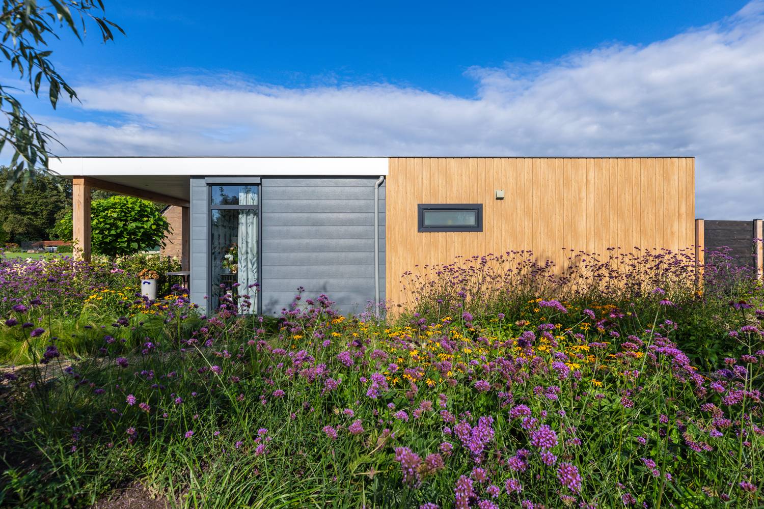 • Modern chalet met veranda en veel lichtinval door de openslaande deuren in de woonkamer.