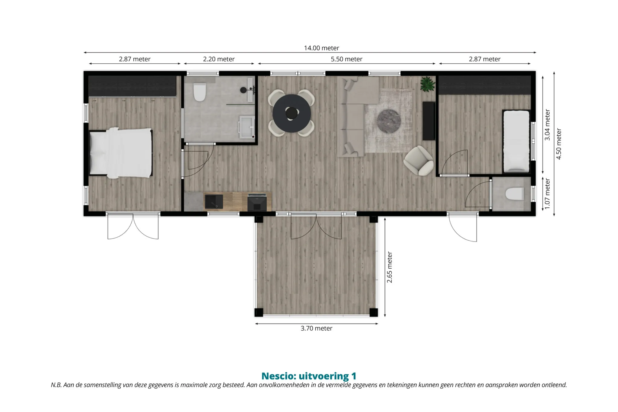 Afmetingen (lxb): 14.00 x 4.50 meter + serre van 3.70 x 2.65 meter
