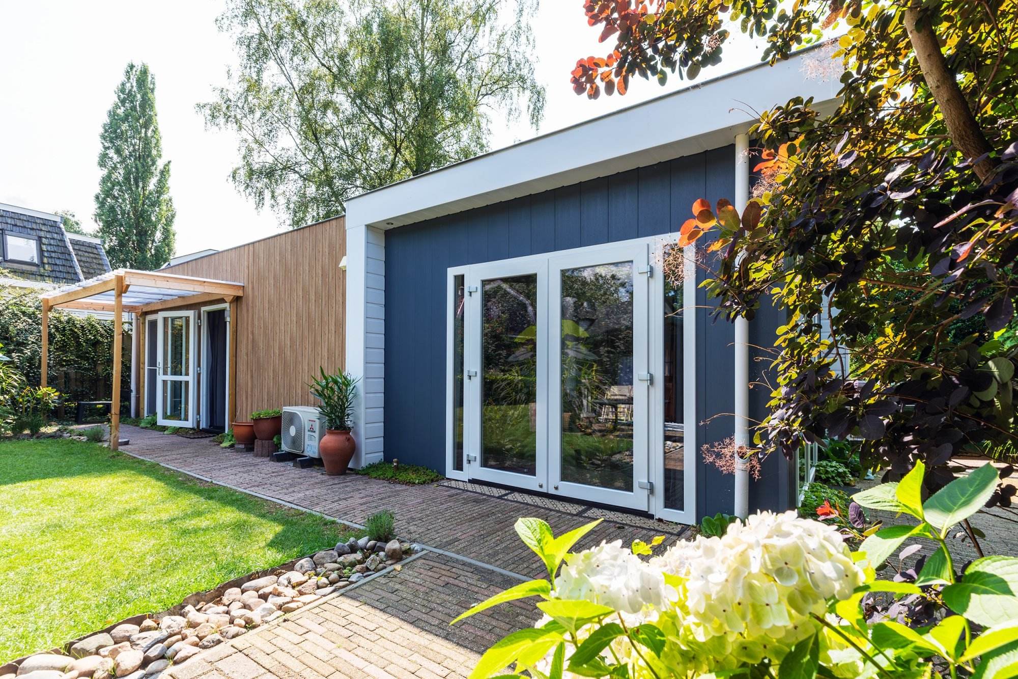 - Mantelzorgwoning met moderne uitstraling en plat dak. Voorzien van grote ramen met veel lichtinval, extra hoog plafond en dubbele openslaande deuren in de woonkamer.